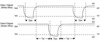 数字信号 图一显示的是读卡器将数字信号以bit的方式发给门禁控制器的一个时序图。这个时序图的Wiegand指导方针是遵照SIA 门禁控制标准协议,这个协议是针对26bit的Wiegand读卡器(一个脉冲时间在20us至100us之间,脉冲的跳变时间在200us至20ms之间)。Data1和Data0信号是高电平(大于Voh),直到读卡器准备发一个数据流过来。读卡器发出的是异步的低电平的脉冲(小于Vol),通过Data1 或者Data0 线把数据流传送给门禁控制盒(如图一的锯齿波)。Data1和Data0脉冲不会交叠,也不会同步发生。表一显示的是F系列指纹门禁机允许的最大和最小脉冲宽度(一个连续的脉冲)和脉冲跳变时间(脉冲与脉冲之间的时间)。 表一 脉冲时间